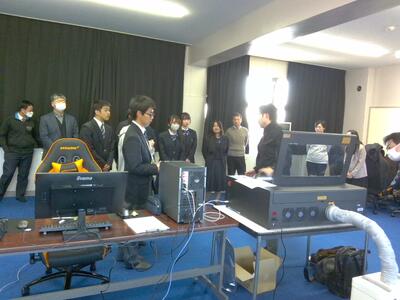 3月9日にデジタルファブリケーション協会の梅澤陽明さんを講師として招き、DXハイスクールにて整備した3Dプリンター・3Dスキャナー・レーザーカッターのデモンストレーションを実施しました。興味のある生徒と職員が参加し、実際に機器に触れながら使い方の説明を受けました。