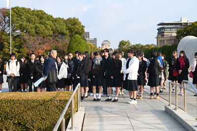 そして、迎えた広島修学旅行では、平和記念公園でガイドさんによる碑めぐり解説を受けると共に、平和記念公園訪問に向けて2年次の生徒全員で折った千羽鶴を奉納しました。また現地では、事前学習で桐生までお越しいただいた石原智子先生に再会することができました。